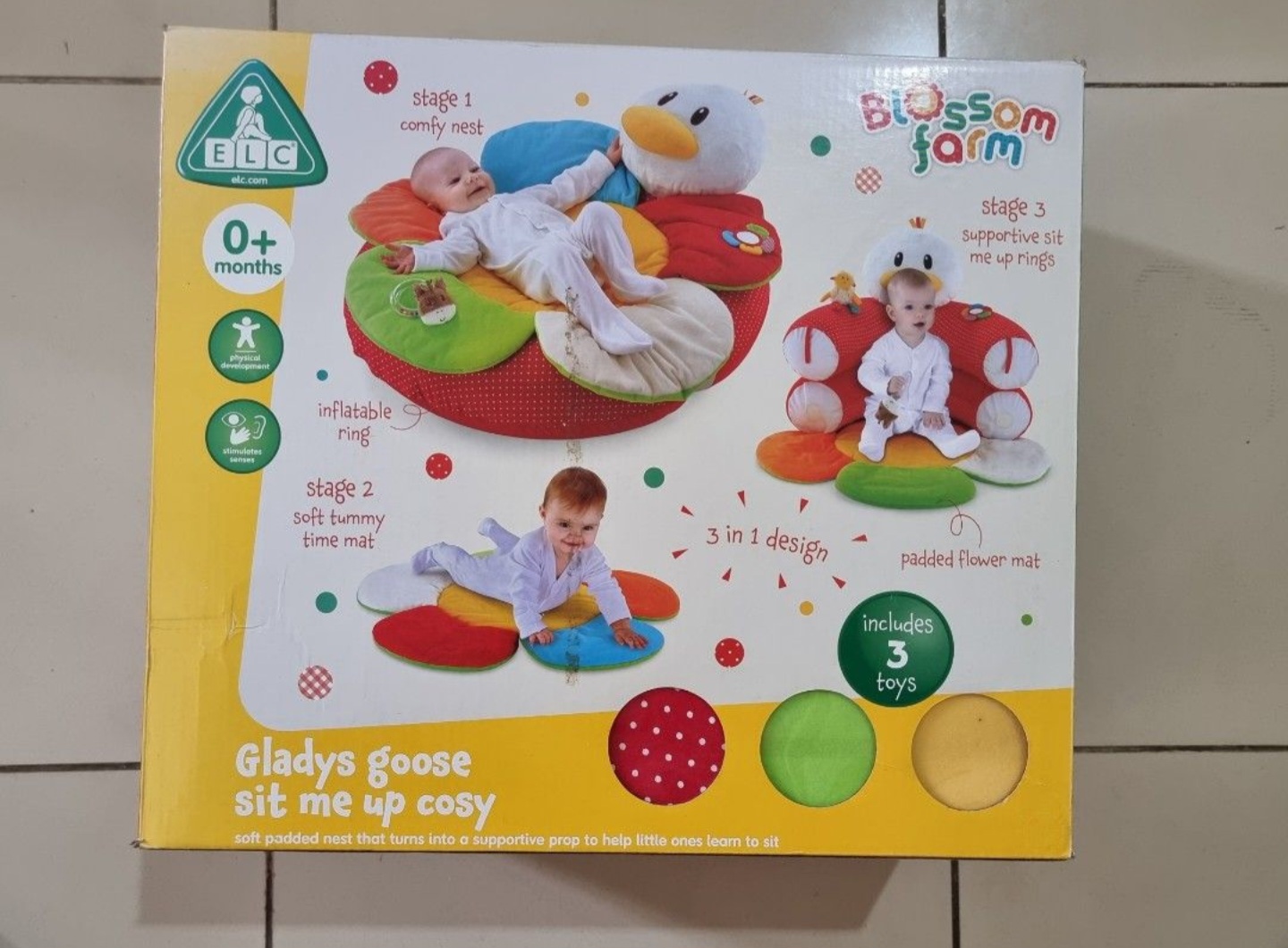 نشیمن چندمنظورهی Blossom Farm Gladys Goose Sit Me Up Cosy یک وسیلهی نرم و ایمن برای بازی و استراحت نوزاد است. طراحی آن به شکل غاز بامزه (Gladys Goose) و از مجموعهی محبوب Blossom Farm است.این محصول هم برای خواب و استراحت نوزاد، هم برای بازی روی زمین و هم برای یادگیری نشستن طراحی شده است.تشک نرم برای نوزاد تازه متولد شده . محل بازی روی زمین با تشک گلدار . صندلی حمایتی برای یادگیری نشستندارای تشک گلدار نرم (Padded Flower Mat)برای بازی و راحتی نوزاددارای حلقههای حمایتی نرم (Supportive Sit Me Up Rings)کمک به نشستن ایمن نوزادشامل 3 عدد اسباببازی آویزی نرمبرای تحریک حواس بینایی، شنوایی و لامسه نوزادجنس پارچهای نرم و ضد حساسیتایمن برای پوست حساس نوزادقابل جدا شدن و شستوشوروکشها قابل تمیز کردن هستندسبک و قابل حملمناسب برای استفاده در خانه یا سفرمزایا و کاربرد:کمک به تقویت عضلات گردن و کمر نوزاد هنگام یادگیری نشستنایجاد محیطی امن و نرم برای بازی و استراحتتحریک حواس بینایی، شنوایی و لامسهکمک به رشد مهارتهای حرکتی و شناختیطراحی رنگی و جذاب برای جلب توجه نوزاد